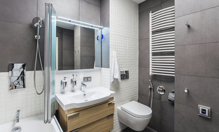 Фотогалерея интересных проектов совмещённого санузла с ванной и душем ↑