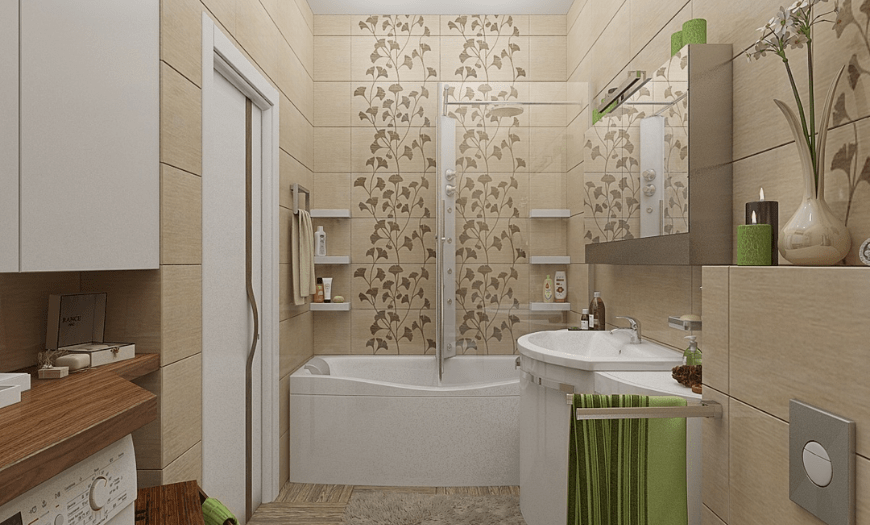 Для того чтобы предусмотреть в таком варианте место для стиральной машинки, заменяют длинную сидячую ванну на компактную душевую кабинку. Самый рекомендуемый и распространенный размер кабинки 90х90 см. Меньшие душевые нерациональны из-за недостатка места внутри, а большие занимают много драгоценного места в интерьере ванной.