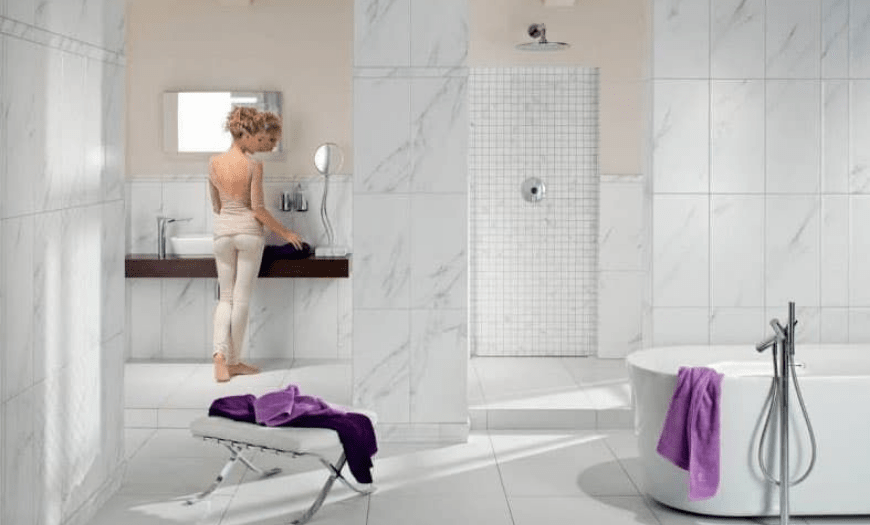 Одной из современных тенденций является сохранение цвета. Красочный минимализм компенсируется интересными дизайнерскими решениями, связанными, например, с графикой на фоне базовой плитки или завораживающими, интригующими конструкциями или игрой с различными поверхностями : матовыми, глянцевыми, полированными и структурированными. Таким образом, вы можете четко разделить отдельные пространства в ванной комнате, избегая цветовых и дизайнерских перегрузок.