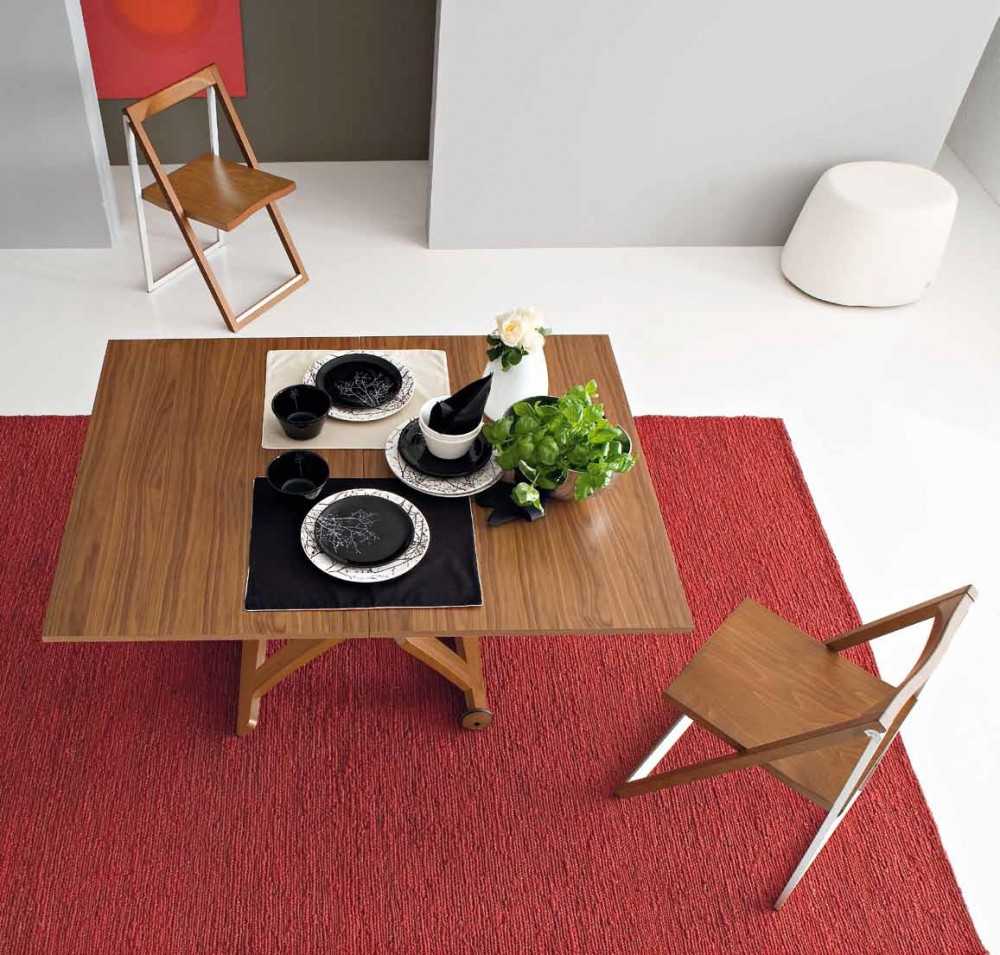 Существуют модели столов-трансформеров, превращающиеся в тумбы и журнальные столики — стилевые решения крайне разнообразны.