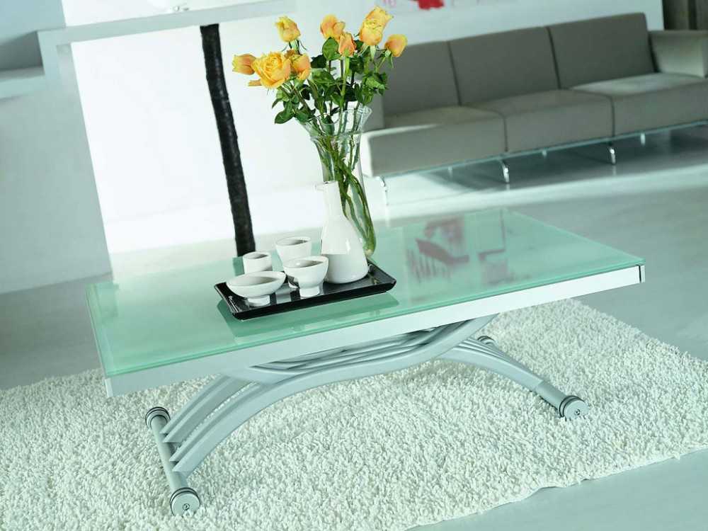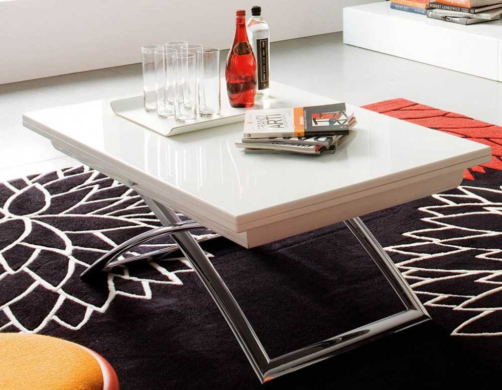 Стол, соединяющий в себе функции обеденного и журнального обычно оснащен механизмом для изменения высоты. Также он часто имеет возможность увеличивать площадь с помощью выдвигающихся или поднимающихся пластин.